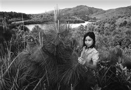 VIETNAM. A Luoi Valley. Checking the tips of the branches for destructive insects among new plantation in a heavily defoliated area. The treeless denuded hills in the distance are covered with scrub - the "American grass" seen bottom left.1987