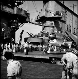 SOUTH PACIFIC. Between October 26th, 1943 and December 9th, 1943 on board the US aircraft carrier USS Saratoga. Traffic problems on the flight deck of an aircraft carrier are handled with a deceptive ease. Here a plane parker in a white helmet is signaling the pilot of one of the new Hellcats to "hold on the right brake and come forward a little on the left." A moment more and the plane will be in position to descend on the forward elevator of the USS Saratoga to the hanger deck.