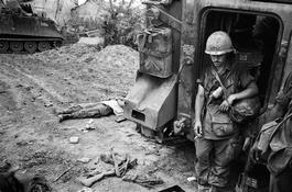 VIETNAM. The battle for Saigon. The problem with "close" artilery support was that it was often too close. on this occasion shells called in by these troops had landed among them. The officer's desperate message to halt the bombardment were not recieved; he had taken up refuge inside an armoured personnel carrier where his frenzied transmissions could not penetrate the metal hull. 1968