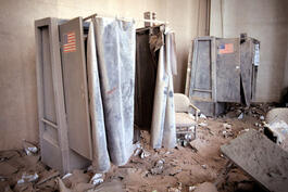 USA. New York City. September 11, 2001. Voting booths in the World Financial Center covered with ash from the collapse of the World Trade Center's Twin Towers. Primary elections for New York City Mayor's race were scheduled for the same day as the attack.