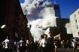 USA. New York City. September 11, 2001. Pedestrians on Church Street run from falling debris as Tower 2, the South Tower, of the World Trade Center collapses at 9:55 a.m. Tower 1, the North Tower, still standing here, collapsed at 10:29 a.m. Seven World Trade Center, the 47-story building seen immediately in front of Tower 1, collapsed at 5:25 p.m.