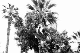 EGYPT. Cairo. April 17, 2012. An ultra-conservative Salafi Muslim man stands on top of a tree during a demonstration against the disqualification of Salafi Presidential candidate Hazem Abu Ismail in front of the Elections Commission in Cairo. Mr. Abu Ismail was disqualified because his late mother held American citizenship.