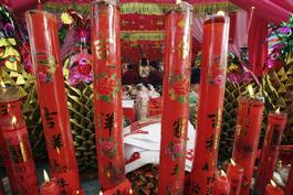CHINA. Chaoshan, Guangdong Province. 2012. The Match of Chaoshan Spring Parade of God Statues. An event to worship ancestors and gods, and pray for well-being and peace for the coming New Year. This event is both used as cultural significance, a solemn form of worship, and social entertainment.