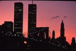 USA. New York City. 1985. World Trade Center and the Brooklyn Bridge. ©Alex Webb/Magnum Photos