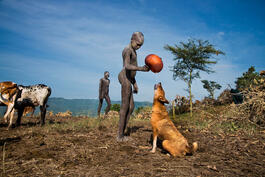 ETHIOPIA. Omo Valley. 2012. A boy from Surma tribe pours juice from a fruit for his dog.