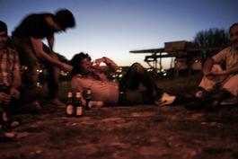 GERMANY. Würzburg. 2013. Afghan refugees drink beer and hang out on a river near a refugee camp in Wurzburg, Bavaria. It is the largest camp in Bavaria and refugees usually spend years there before their status is resolved and they are granted residency, or they are deported back to their home country. The refugees are housed in a barracks from the Nazi era and receive a small subsidy from the German government. There is widespread frustration and depression in the camp, including a recent suicide by an Iranian refugee and a hunger strike by another group