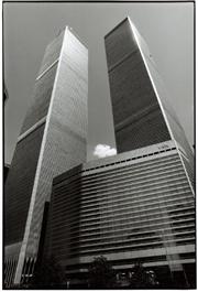 USA. New York City. 1987. World Trade Center twin towers and Marriott WTC Hotel.