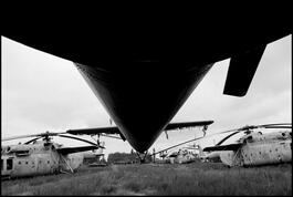 UKRAINE. Rasoha. 2000. Thousands of trucks, helicopters, military vehicles and heavy equiptment used in fighting the fire and clean-up that were lethally contaminated and were buried or collected within the 30km "hot zone."About 15% of the still dangerous pieces are sealed off behind fences and armed guards at a site in Rasoha.