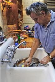 USA. New York City. February 21, 2010. Restaurateur Keith MCNALLY washs the dishes after dining with his kids.