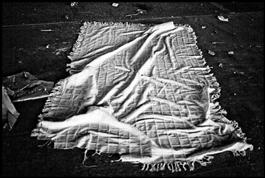 GREECE, Athens. July 2009. A blanket lays on the ground under a bridge where hundreds of undocumented asylum seekers wait for hours each week in the middle of the night to have a chance to apply for asylum in the Petro Rally district of Athens.