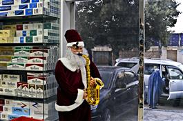 AFGHANISTAN. Kabul. August 27, 2009. A Santa Claus mannequin that dances and plays the saxaphone in 'Finest Supermarket,' a western store in Kabul. Outside, a woman in a burqa begs for spare change.