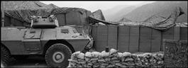AFGHANISTAN. Winter 2009. Kunar Province. MRAP (Mine Resistant Ambush Protected Vehicle) "inside the wire" of Observation Post (OP) Pirtle-King in northern Kunar, the most active area for insurgent attacks.