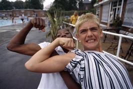 G.B. ENGLAND. London. Brixton. Kids at the lido swimming pool show off. 1995.