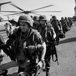 Italy. The Adriatic Sea. US Navy 6th. Fleet NATO Battle Group, during conflict with Serbia over Kosovo.USS KEARSARGE: Is a multi purpose Wasp class amphibious landing assault ship, her primary mission is the embarkation, deployment, landing and support of a Marine landing force. The first ships to use the Air Cushion Landing Craft (LCAC) which is a fast moving large hovercraft capable of landing large forces of Marines and equipment to a beachhead. The ship has onboard aside from its crew a full detachment of 2200 marines ready for deployment. For close air support the ship has large flight deck equipped with Harrier II jump jets, and a full range of Navy and Marine Corps helicopters. Marines on route to Camp Hope in Albania.