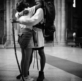SPAIN. Galicia. Santiago Cathedral. A group of ex-drug addicts arrive at the Cathedral after fifteen days walking. On arrival they are given a letter from their parents and family, the letter is unexpected and most of them burst into prolonged crying. The group is part of Encorde 98, a charity based in Valencia who run a one and a half year program. 1998.