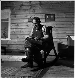 FINLAND. Man playing a self-made "Kantele" (a traditional musical instrument, which has a triangular shape and strings running across the top). 1948.