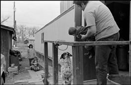 USA. Montana. 1999. Crow Indian Reservation. A child, his dog and his father in government trailer. In spite of over-crowding and bad housing, extended families, sometimes three or four families per house, share space and accommodation. Housing remains the greatest immediate need on the Crow people. Unemployment runs as high as 60% in the winter months.