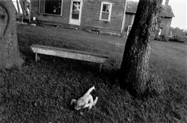 CANADA. Lambton County, Ontario. 1990. Young Noah TOWELL at a few months of age crawls on the lawn discovering grass and the sensation of grass. Behind him is his home and the home of photographer Larry Towell.