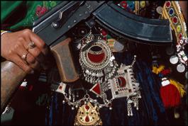 AFGHANISTAN. Kabul. May 27, 1986. A Muslim woman in traditional clothes and jewellery celebrates the anniversary of the Coup d'Etat of 1978 when Communists seized power. She holds a Russian-made Kalashnikov submachine gun.