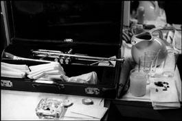 In his room, before a concert, Louis Armstrong's trumpet is carefully packet in its case with the handkerchief he uses while playing. Next to the case is a glass of orange juice, Louis Armstrong is a great adept of a healthy type of life.