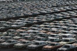 Parking lot full of new General Motors intermediate cars waiting to be shipped out