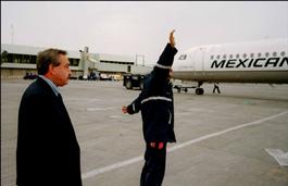 Mexico. Nuevo Leon. Monterrey. Groundstaff wave out departing Mexican aircraft with schoolboy gesture.