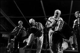 FRANCE. Aquitaine region. Gironde departement. Uzeste. Big top "Dexter Gordon". "Uzeste Musical" festival 11th edition. In the foreground, from left to right : French jazz musician André LASSALLE (accordion), Argentinian jazz musician Juan José MOSALINI (bandoneon), French jazz musicians Jean PASCUAL (accordion) and Loris CAPELLI (accordion). Final jam session. "SOUFFLE A LAME". Sunday, August 19th 1990.