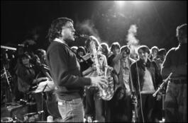 FRANCE. Provence-Alpes-Côte d'Azur region. Var department. Ollioules. Châteauvallon festival "Musique ouverte" first edition. In the foreground, French jazz musician Michel PORTAL (clarinets, saxophones, bandoneon). Jam session at the end of the concert with spectators dancing on the stage. MICHEL PORTAL UNIT. Monday, August 23rd 1976.