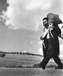 ISRAEL. 1950. An orthodox Jew with his prayer shawl and a sack of vegetables leaving his village.