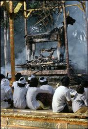 The royal family watches the cremation of the corpse as it hangs beneath the paper bull.