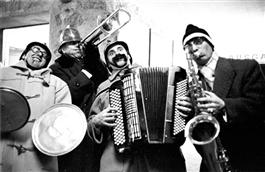Switzerland, St. Moritz. NYE party at Corviglia Club. The Palace Hotel Italian band meets guests at the top of the fornicular. 1959. ©Burt Glinn, Magnum Photos