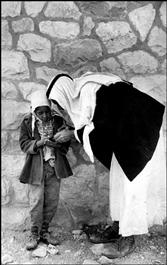 Bedouin father with his son, who learned how to write and is writing down the address of their settlement in the Negev desert.