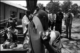 French jazz musicians Aldo ROMANO (drums), Henri TEXIER (bass) and Louis SCLAVIS (clarinets, saxophones), visiting Saint Peter Primary School where young musicians from M.LISADA PROJECT are rehearsing. Saturday 20th September, 1997.