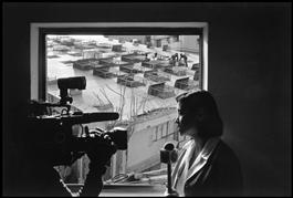 TAIWAN. Taipei County. 1999. A Hong Kong TV crew carries live coverage of an earthquake in Northern Taiwan while rescue workers search for survivors in a destroyed building.