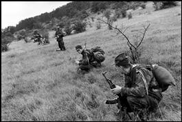 BOSNIA. Near Bosanski Petrovac. 1995. Bosnian soldiers crouch on a hill while on patrol.