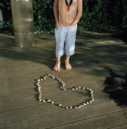 GB. London. Gee Street. The 'Loft' apartment of Peter Marlow and Fiona Naylor in the Clerkenwell area of London. Their home is a conversion of a complete floor of an old industrial building, built in 1952 that used to be a warehouse for silk and then later a printing works for the oil company BP. In the summer of 1999 Fiona and Peter created a large garden on the roof of the apartment. With cedar decking and river pebbles from Scotland, Max their son, who was then six years old, plays in his pyjamas, with some of the pebbles and makes a 'heart' shape on the deck.