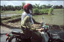 INDONESIA. Java. 1989. While driving, a Muslim woman wears her motorcycle helmet over her hijab.