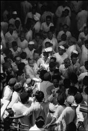 INDIA. Bombay, on Mayo road. The Bombay Stock Exchange (called the SHARE BAZAAR), the brokers on the 'floor' are under a big shed outside in the courtyard. The place is absolute bedlam with waving of handings indicating "sell" or "buy" exploding into a near riot. 1959.