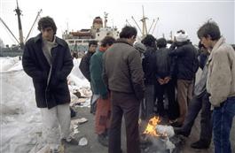 Italia, Brindisi: Albanian refugees on the dock of the port. (c) Ferdinando Scianna/Magnum Photos