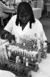 Etudiante en stage à l'Institut Pasteur, manipulant des tubes test.