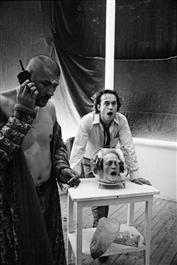 Vincent PEREZ devant son masque fabriqué par le responsable des effets spéciaux et du maquillage Benoit LESTANG. A côté de lui, un comédien ouzbek.