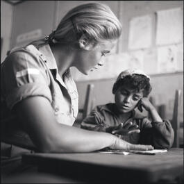 Sara'le, a soldier teacher, born in the Kibbutz of Shefayim. During the 1950's women soldiers fulfilled functions in the absorption of immigrants, education and teaching, youth instruction, weapons training for adults, and "adoption" of border settlements.