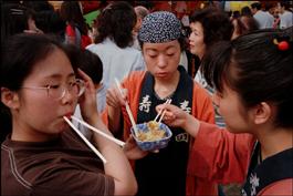 JAPAN. Honshu. Tokyo. Young girls at the Asakusa Festival dig into a shared meal with their chopsticks.