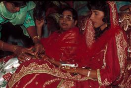 MAURITIUS. Port Louis. 1992. Muslim wedding. Guests put henna on brides hands. Muslim ritual.