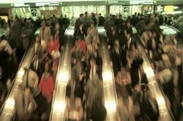 USA. New York City. 1984 . Commuters take escalators to the subway during rush hour at the World Trade Center.