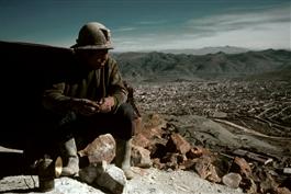 BOLIVIA. Potosi. Miner at summit of Cerro Rico looks down on Potosi. 1991.