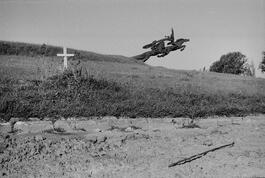 UKRAINE. Eastern Ukraine. 1993. A heroic monument with leaping horses in memory of the Red Army during World War II, in the foreground a small white cross marks the spot where a mass grave was found of victims of the war.