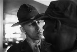 USA. Parris Island, South Carolina. A drill sergeant delivers a severe reprimand to a recruit. 1970.