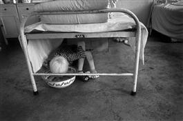 Tienjin, Qing Ying, age 12, an extreme case of mental disability, suffering also from albinism. She was transferred 2 years previously from an orphanage, everyone in the institution likes her because she is a child. Here she is crouched under a bed drinking water from a bowl.