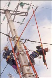FRANCE. Rhone-Alpes region. Haute-Savoie department. Megève. EDF. 1998. Putting up an electric line with insulated poles.